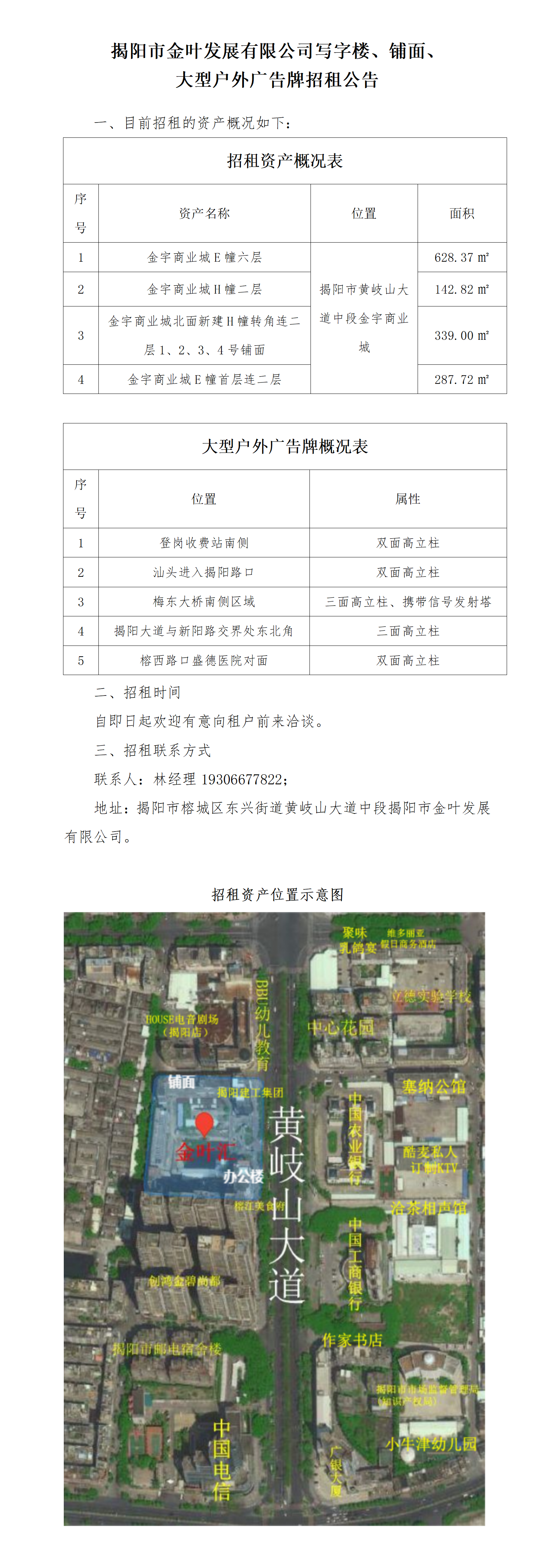 揭陽市金葉發(fā)展有限公司寫字樓、鋪面、大型戶外廣告牌招租公告